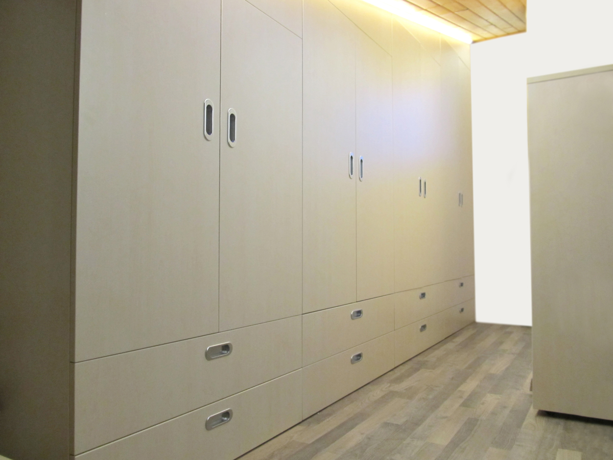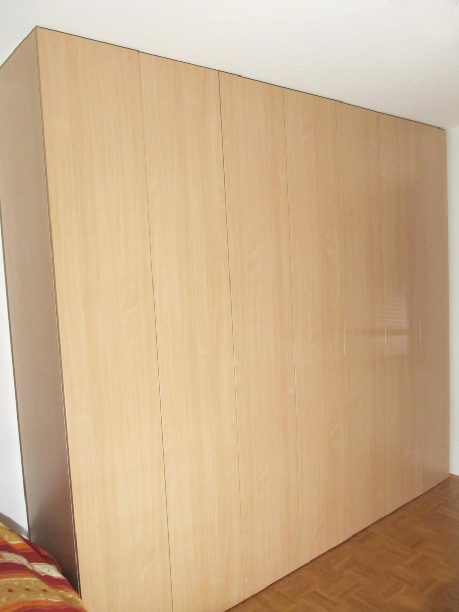 Notranjost vgradne omare in hrbtišča so izdelana iz 19 mm dekorativnega iverala navadno v beli barvi. Vsako hrbtišče naše vgradne omare je debeline 19mm, da vedno ostane ravno in kljubuje tudi manj ugodnim mikroklimam. Notranjost vgradne omare je podrejena vašim željam: police, izvlečne police, predali, stalaže, mrežaste košare, garderobna dvigala, izvlečni in prečni obešalnik, obešala za hlače, pasove ali kravate.